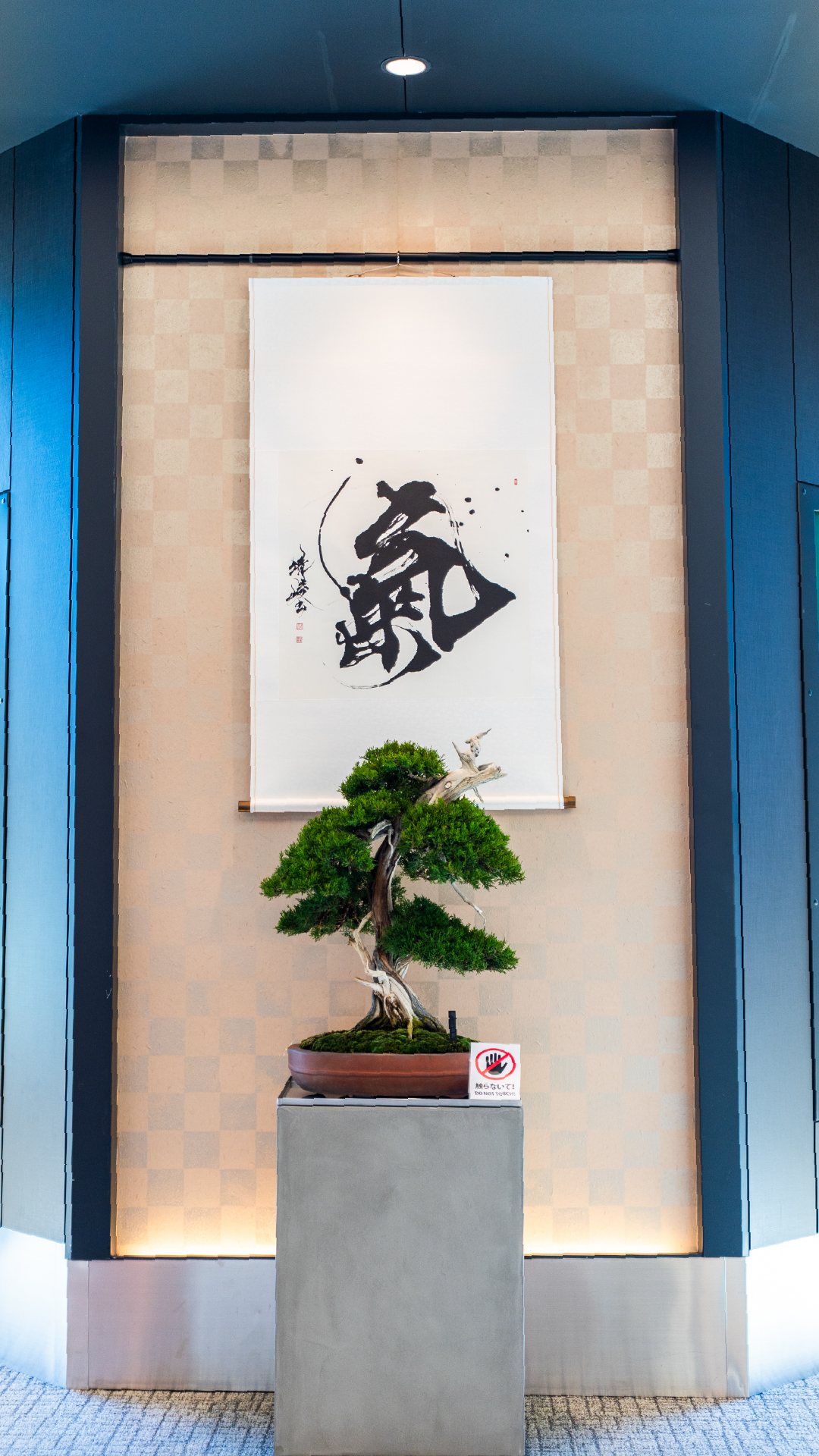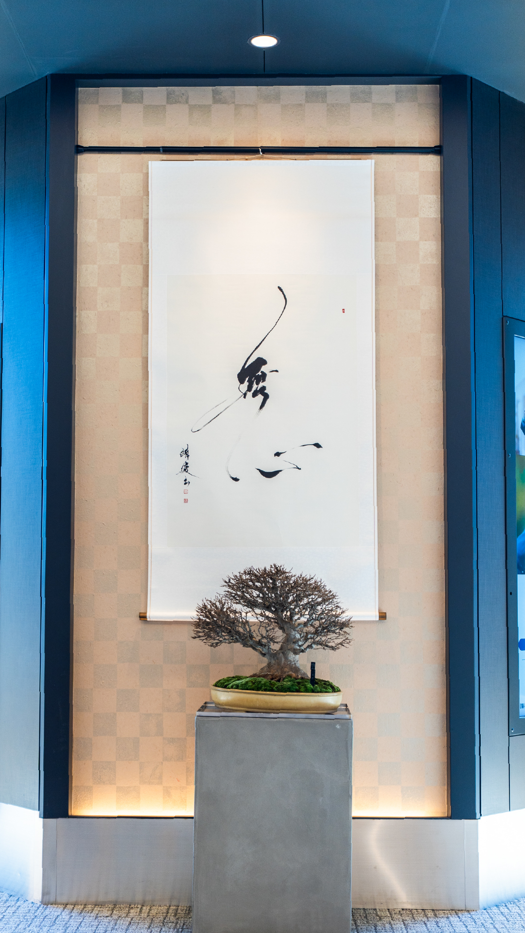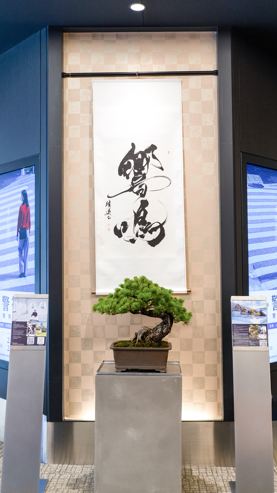 盆栽と書が同じ空間にあることで、それぞれの存在感がより際立ち、静かな緊張感と調和が生まれました。